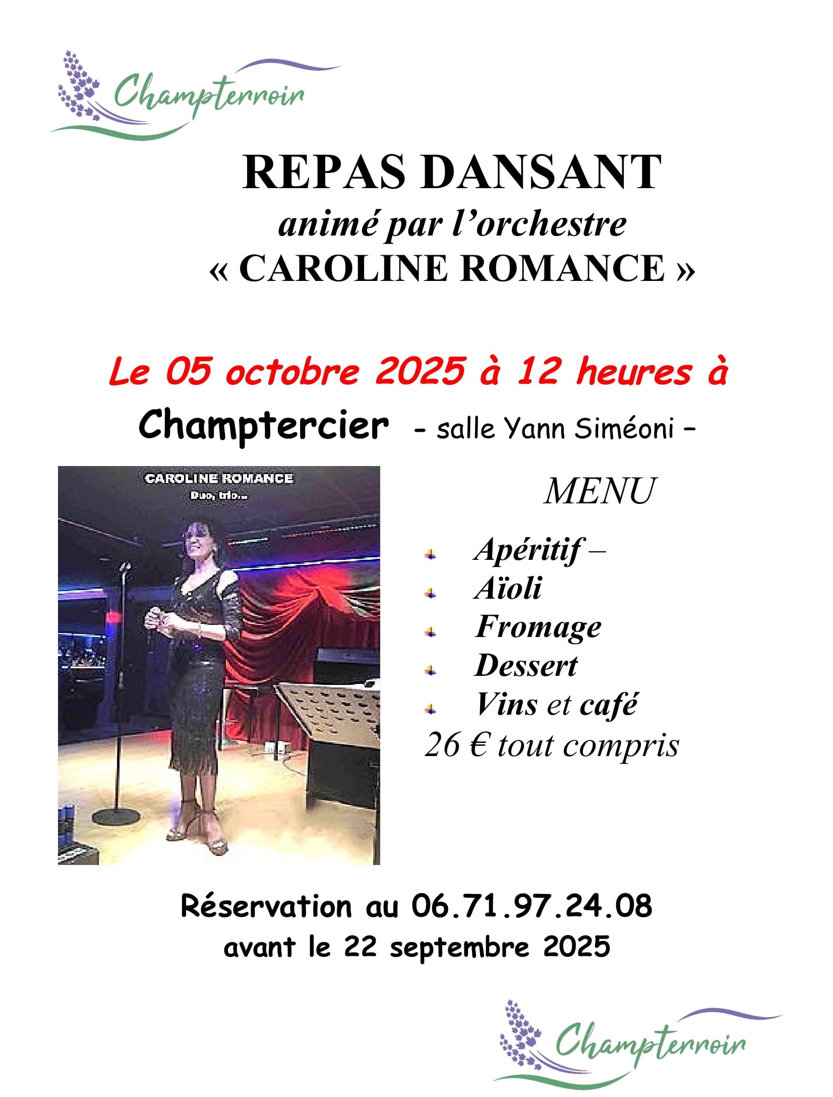 C’est la rentrée pour Champterroir qui vous propose, comme chaque année le repas dansant d’octobre; retenez cette date du 5 octobre à 12 heures , l’animation sera assurée par l’orchestre « CAROLINE ROMANCE ».